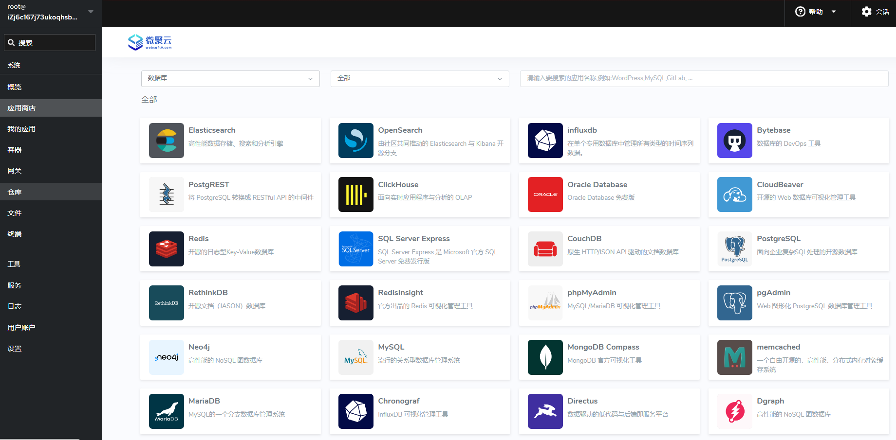 登录 Websoft9 控制台,进入 应用商店 下的 数据库,列出所支持的数据库