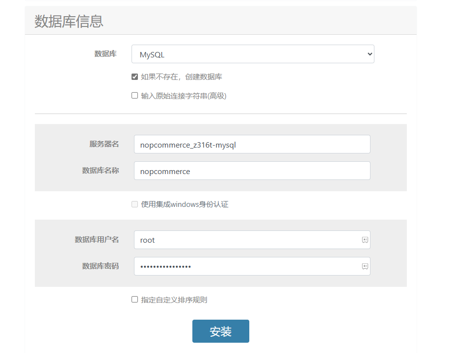 - 数据库类型:MySQL,并勾选 如果不存在,创建数据库