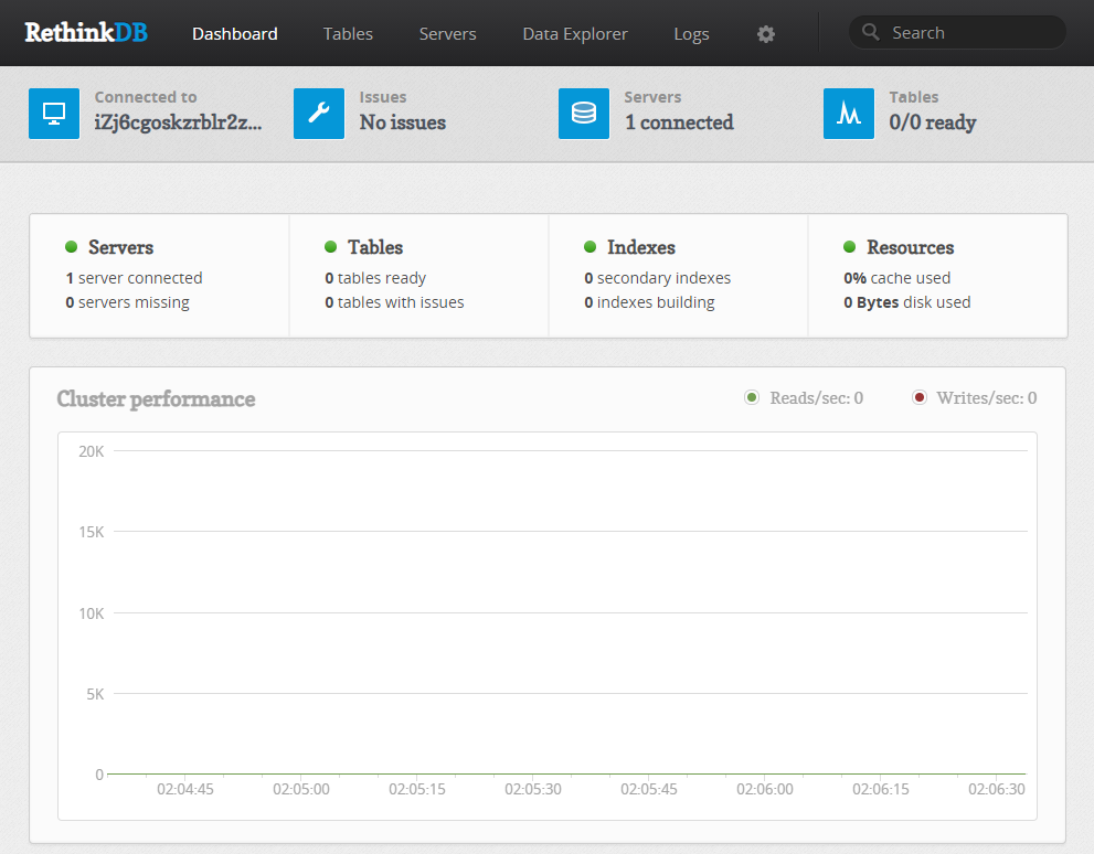使用本地电脑的浏览器后,直接进入 RethinkDB 控制台