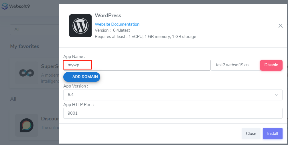 Deploy applications easily from Websoft9 App Store, featuring 200+ templates one-click install application.